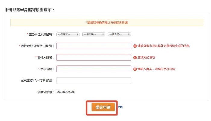 点击申请幕布,填写收件地址,在备案系统中查看结果页面。