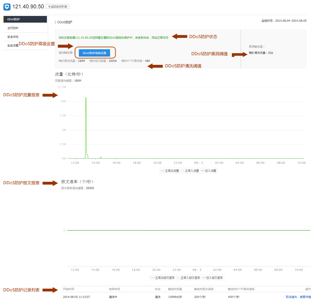 3、当前的DDoS事件:展示当前所选云服务器的DDoS攻击现状。